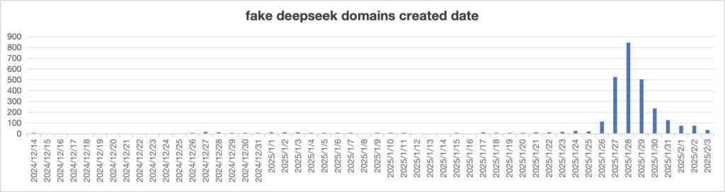 根据对2024年12月1日至2025年2月3日期间的域名注册情况进行了统计分析,发现在此期间共出现了2650个仿冒DeepSeek的网站。大规模的仿冒域名注册活动从2025年1月26日开始,并在1月28日达到高峰,尽管随后的增长幅度有所减少,但仿冒域名的数量仍在持续增加。