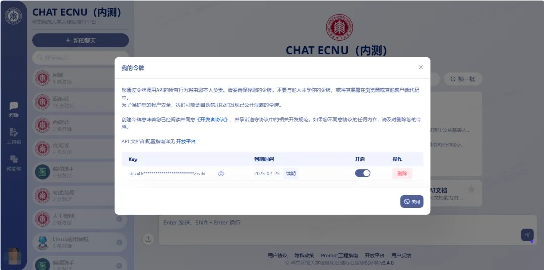 据了解,ECNU大模型平台还提供了许多其他实用功能,免费的API调用令牌、强大的科研助手、AI联网搜索、新闻摘要生成、文生图、文档对话、图片理解等一应俱全。