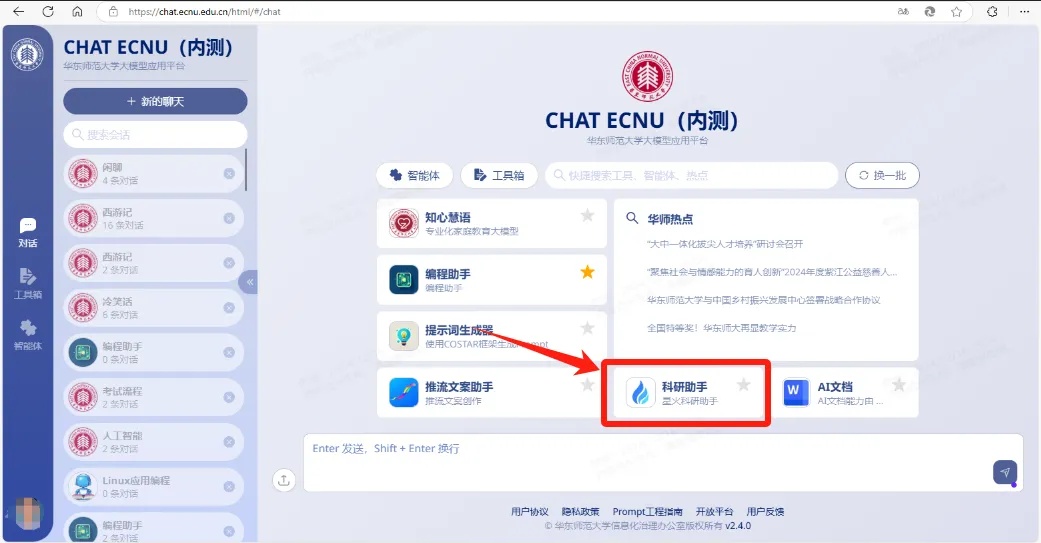 1.访问链接 https://chat.ecnu.edu.cn/html/ 2. 公共数据库-ECNU大模型(内测)