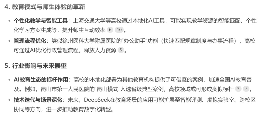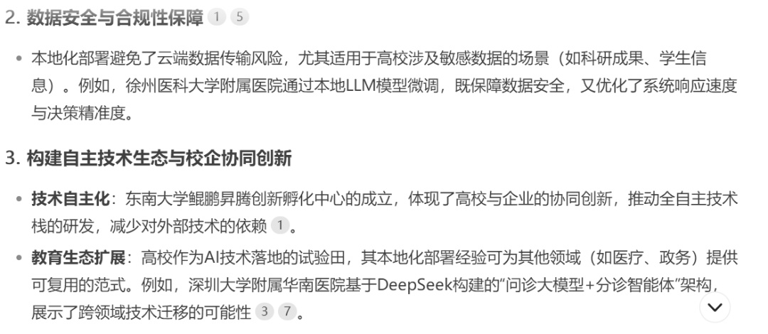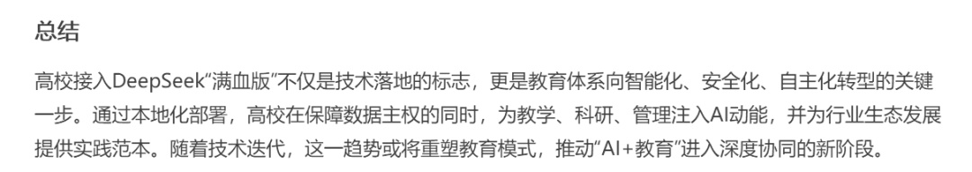 除了上述三所在2月17日“不约而同”官宣接入DeepSeek的高校,小编还了解到,华中科技大学、东南大学、河北工业大学、湖南大学、国家开放大学等已于近期完成DeepSeek“满血版”的本地化部署工作。此外,中国政府采购网显示,2月10日,山东中医药大学就智慧课程建设项目发布更正公告,在更正内容中提到“能对接DeepSeek”模型。 “高等教育圈”动作频频,链接DeepSeek“满血版”的强大能力并完成本地化部署,意味着什么?小编就这个问题请教了DeepSeek“本尊”,来看它的回答(深度思考过程略)—— 对此,您怎么看? 欢迎在评论区分享观点~