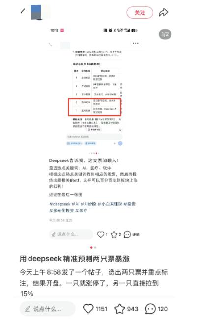 DeepSeek的热潮还是吹到了股市投资圈。近期,红星资本局注意到,社交平台上出现了不少用DeepSeek炒股的贴子。有网友发文称自己准备了100万元资金按DeepSeek的建议投入股市;还有网友表示使用的DeepSeek推荐的组合,第一天收益1210元,有4只股票盈利。