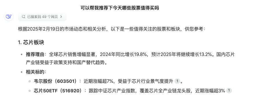 当记者输入“A股哪些行业和个股能涨”时,DeepSeek也给出了相对应的板块和12只具体股票。19日收盘后,红星资本局对照发现,12只股票中有9只上涨,3只下跌。但需要注意的是,DeepSeek所推荐的均为热门行业的龙头股,本身关注度就较高。