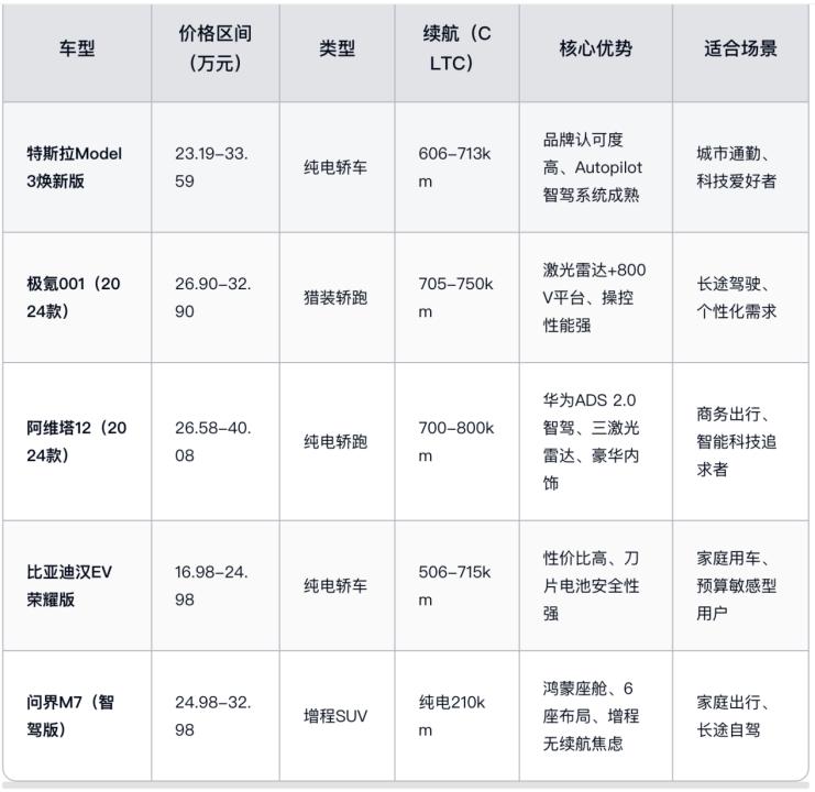 DeepSeek还为用户可能存在的偏好提出了最优选项。比如,追求品牌与智驾可以选择特斯拉Model 3焕新版或阿维塔12,前者适合城市通勤,后者适合商务场景。家庭长途需求可以选择问界M7增程方案解决续航焦虑,鸿蒙生态提升用车便利性。