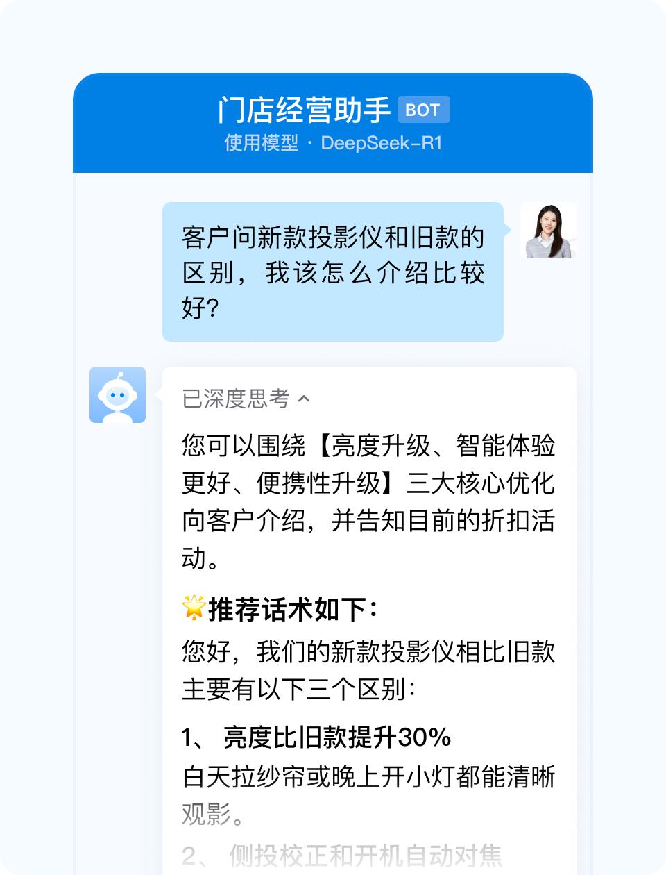 IT之家从官方介绍获悉,接入 DeepSeek、混元等大模型的「智能机器人」不仅能准确回答公司内部员工的问题,还能帮一线员工更好地应对有难度的客户咨询。不论是复杂繁琐的产品细节、还是需要推理思考的搭配方案,智能机器人都能及时给一线员工准备好话术,帮助他回答好客户的问题。