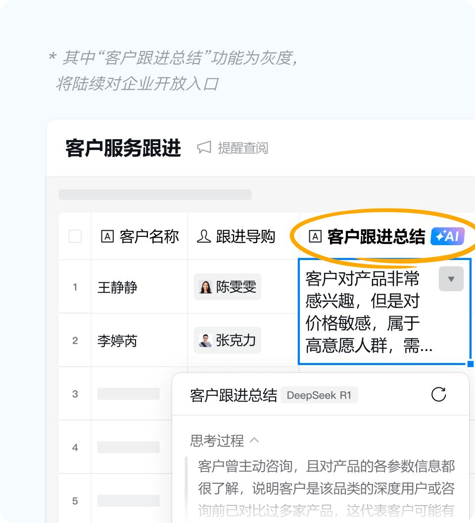 智能表格的“客户服务跟进模板”,也接入了 DeepSeek,能帮企业自动生成每位客户的跟进总结,比如提炼近期客户兴趣点、下单意向等重点信息。