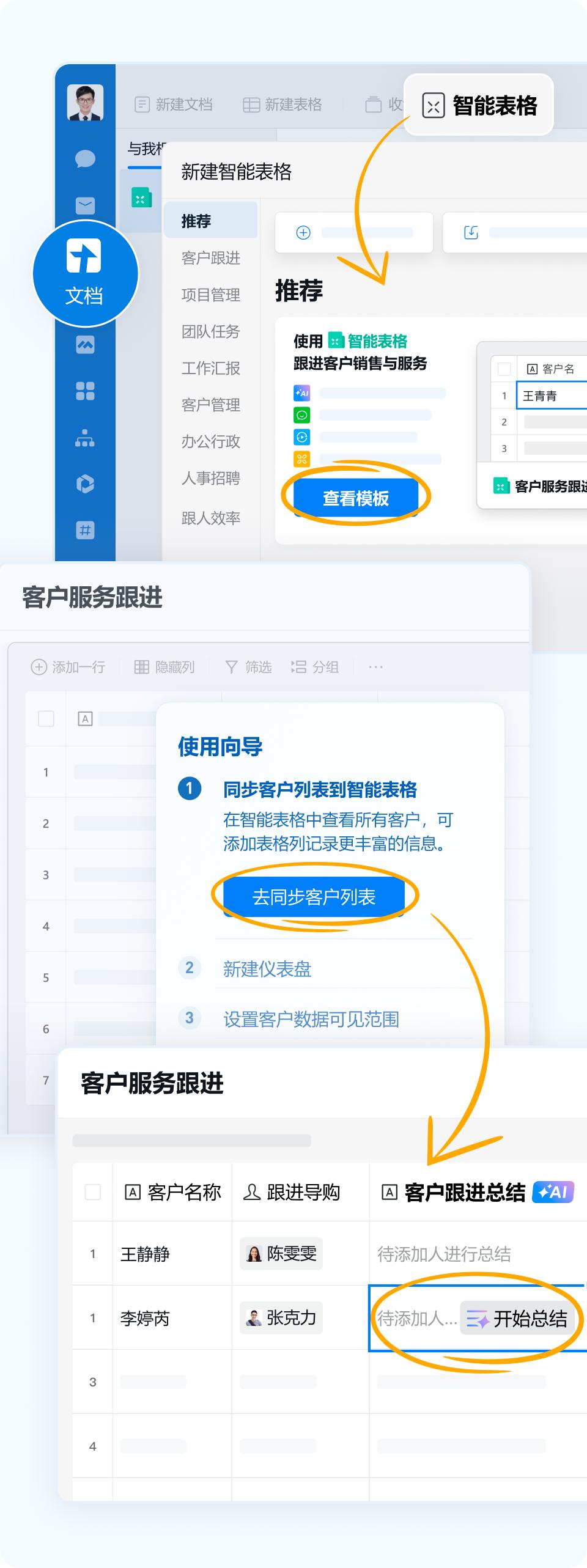 打开「智能表格」的客户服务跟进模板,一键导入客户列表,在“客户跟进总结”列点击“开始总结”,就能自动生成客户的跟进总结。