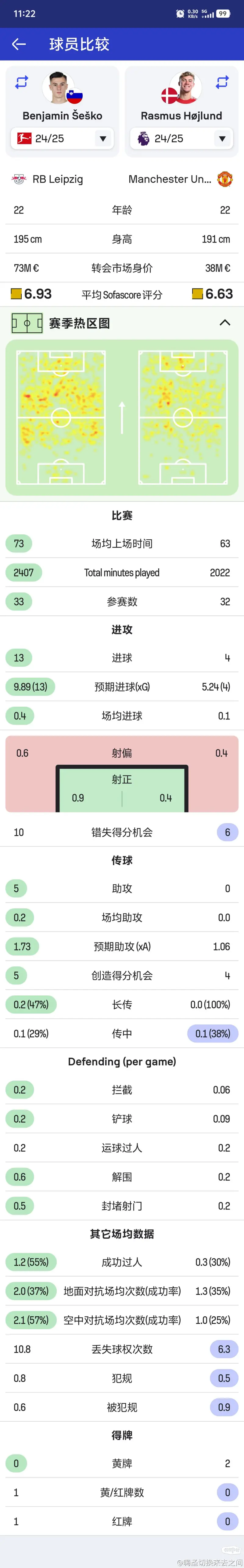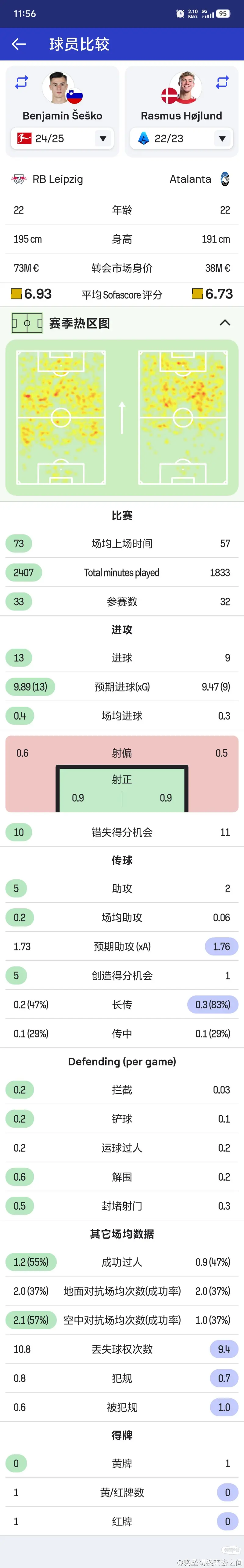 不用细看,就看谁都数据蓝底更多,一眼望过去就是几乎全包围,当然了,比霍伊伦数据还差的知名前锋,确实也不好找了。值得留意的一点,从数据看,塞斯科的空中对抗能力比霍伊伦好太多了,部分原因是德甲的对抗不如英超,但一路看来的球迷也很清楚,霍伊伦对抗确实是抽象。