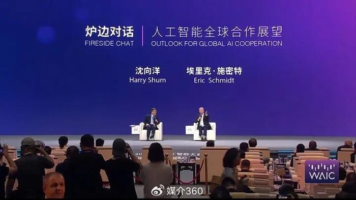 在世界人工智能大会(WAIC)上,前 Google CEO 埃里克·施密特(Eric Schmidt)围绕「人工智能全球合作展望」的主题,与港科技大学校董会主席沈向洋展开了一场「炉边对话」。