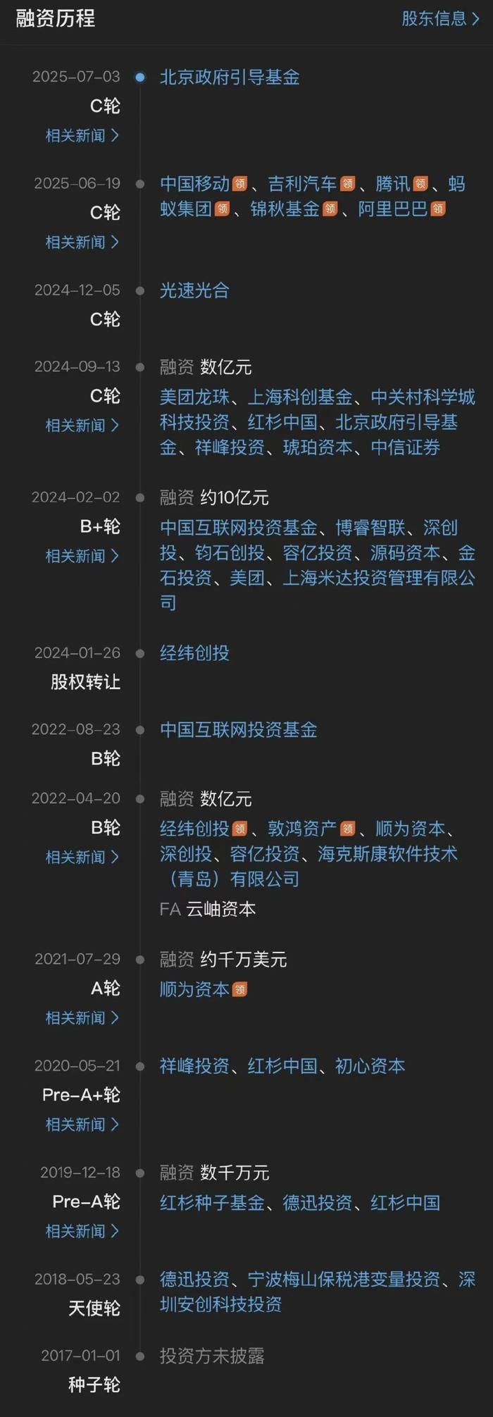 今年6月的C轮融资,投资方里有中国移动基金、腾讯、阿里巴巴、蚂蚁集团这些大公司,之前美团、红杉中国、经纬创投也都投过钱。