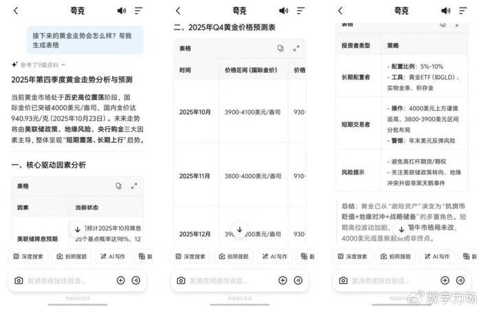 而夸克对话助手面临复杂任务时,表现更丝滑:我问它“接下来黄金走势会怎么样?帮我生成表格说明”,它会自动完成“调用搜索获取最新数据-启动数据分析模块处理数据-调用图表生成工具创建表格-整合结果输出”的全流程。