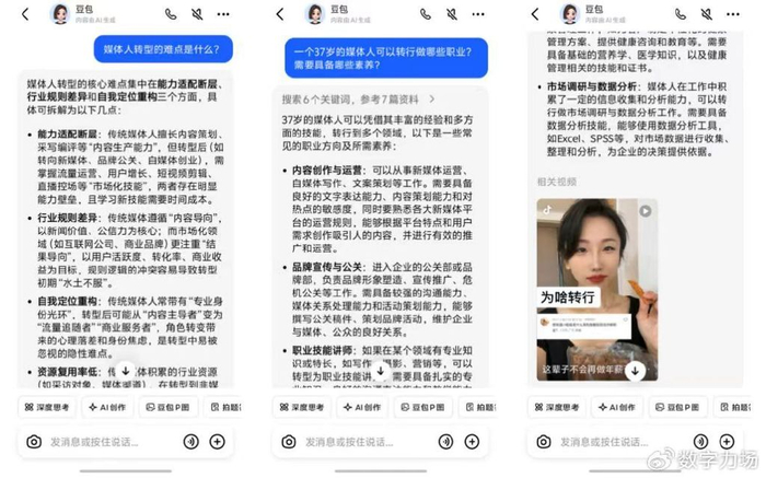 我问豆包跟夸克对话助手“媒体人转型的难点是什么”,接着又追问“37岁媒体人可以转行做哪些职业,需要具备哪些素养?”豆包给出的转型选项相对“普适”,对所需素养也讲得较泛;夸克则能抓住“37岁”这点,从高匹配度转行方向、核心素养要求、转型策略三个维度展开了回答,还能提供可参考路径案例、具体技能要求等。