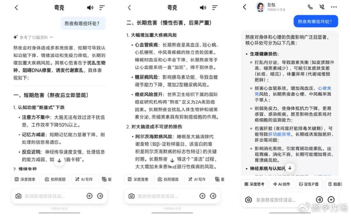 我问豆包跟夸克对话助手“熬夜有哪些坏处?”豆包比较简洁笼统地谈到了“生理健康损害”“神经系统与认知问题”“其他隐性危害”,夸克对话助手则分为短期危害、长期危害、如何减少熬夜伤害三块作答,一并给出的还有生物学依据、医学原理与外部症状等。