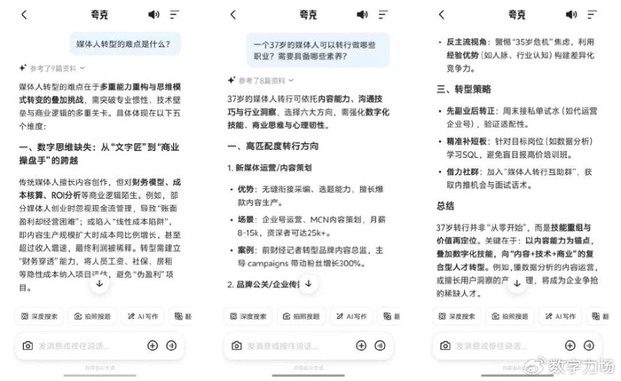 我问豆包跟夸克对话助手“媒体人转型的难点是什么”,接着又追问“37岁媒体人可以转行做哪些职业,需要具备哪些素养?”豆包给出的转型选项相对“普适”,对所需素养也讲得较泛;夸克则能抓住“37岁”这点,从高匹配度转行方向、核心素养要求、转型策略三个维度展开了回答,还能提供可参考路径案例、具体技能要求等。